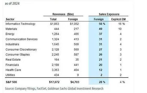 高盛汇总发现,信息科技、原材料、能源、通信服务、医疗保健和工业公司的海外敞口占比较高。