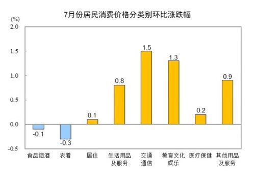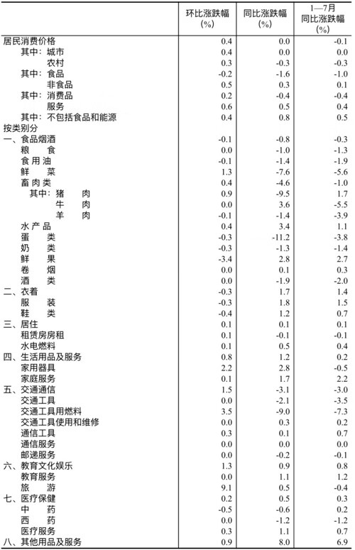 7月份,全国居民消费价格环比上涨0.4%。其中,城市上涨0.4%,农村上涨0.3%;食品价格下降0.2%,非食品价格上涨0.5%;消费品价格上涨0.2%,服务价格上涨0.6%。