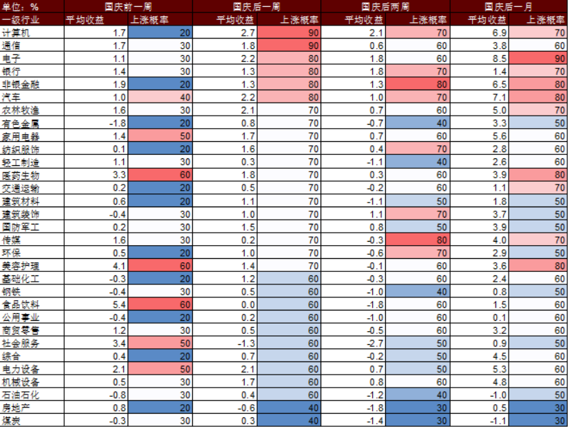 招商证券张夏团队在9月26日发布的研报中表示,从近十年国庆节后行业表现来看,国庆后一周一级行业上涨概率多数在50%以上,其中上涨概率靠前的行业集中在计算机、通信、电子、银行等行业,其中银行、非银金融、汽车在国庆后两周和国庆后一个月上涨概率仍然较高。